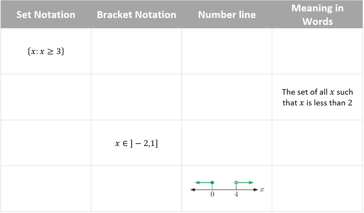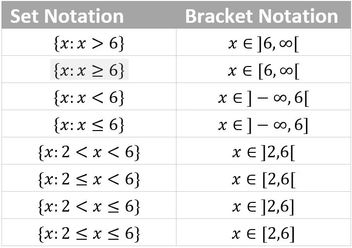 In bracket notation the symbols [ and ] are used, and end points are listed a bit like a coordinate. If the bracket ‘closes’ towards the number, it includes the value. If the bracket ‘closes’ away from the number, it is not included.