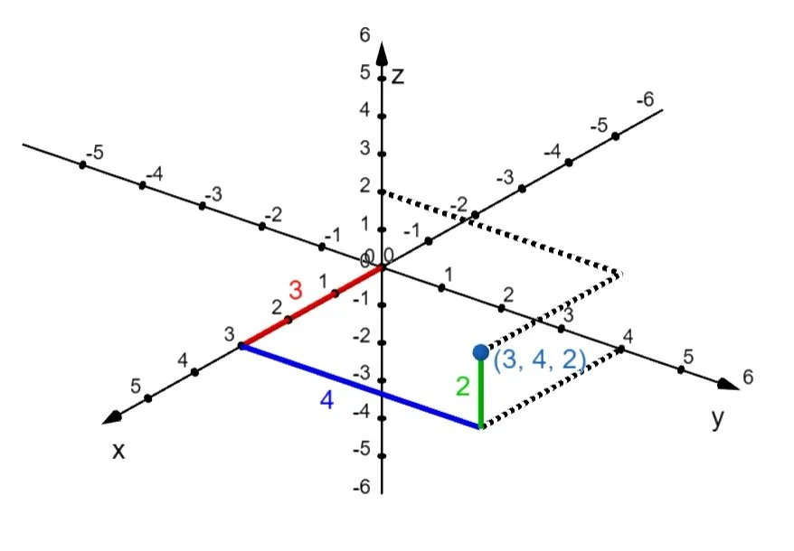 The point \(\left(3,4,2\right)\) is located \(3\) along the \(x\)-axis (out of the page), \(4\) along the \(y\)-axis (left/right in the page) and \(2\) along the \(z)-axis (up/down in the page).