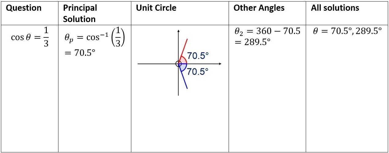 Don’t forget to find all the solutions in the given domain. For a simple trigonometric function with domain \(0^{\circ}\le\theta\le 360^{\circ}\) there are always two solutions.